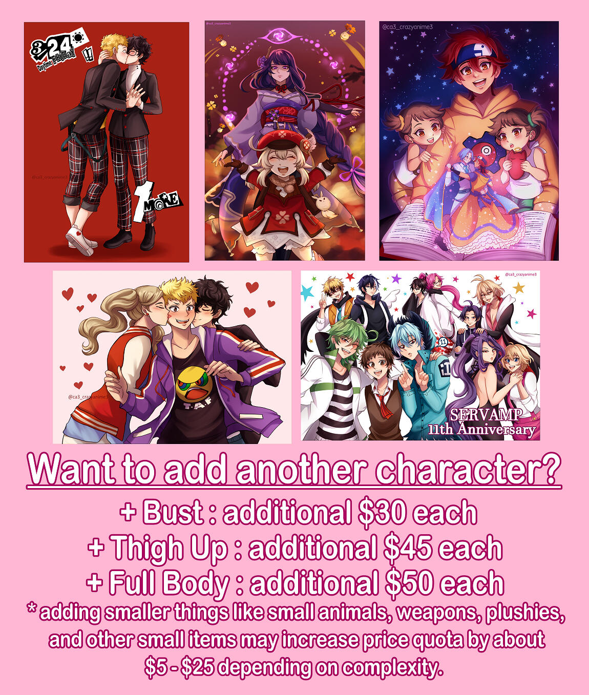 Making any small changes or additions to your commission won't have any additional charges! (For example, changing the eye color or adding a tiny accessory that I may have forgotten to include won't cost anything extra. So don't hesitate to tell me!) But more major ones will have additional charges (price will depend on complexity of revision or alteration, prices may vary from $5 to $20) However, if minor revisions exceed 8(+) requests, you maybe charged an extra $5 for them.